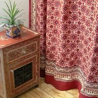My bathroom is deep red and chocolate. I have been looking for a shower curtain that adds contrast from the solid towel colors for a long time...this curtain was perfect! I've been to India and seen beautiful color blocked textiles. The color blocking is high quality, material is a soft cotton, and it's well constructed. The only caution is that the description describes the accent color as black and the accents on mine were dark brown (which worked even better for me!). I'm tempted to order the matching bedding!