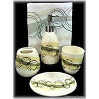 It's exactly what you see in the picture. Although we thought the shower curtain was too thin to be by itself so we got a cheap shower curtain liner from Wal-Mart and let this one hang outside the shower. There was a slight chip or two when I got it all but it's hardly noticeable unless you're looking for it. Was a perfect set for the money. Much cheaper than a lot of other sets.