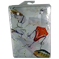 This shower curtain is perfect for a fishing-themed bath. It's a true white with all sorts of fishing lures in greens, orange-reds, and gold tones. The lures are larger than they appear in the picture (about 4 to 6" long). The colors make this curtain easy to coordinate with a variety of color schemes. It isn't very thick, so you need a clear or lightly colored liner behind it. The hooks are included(nice touch). My husband finally gets a bathroom without flowers!